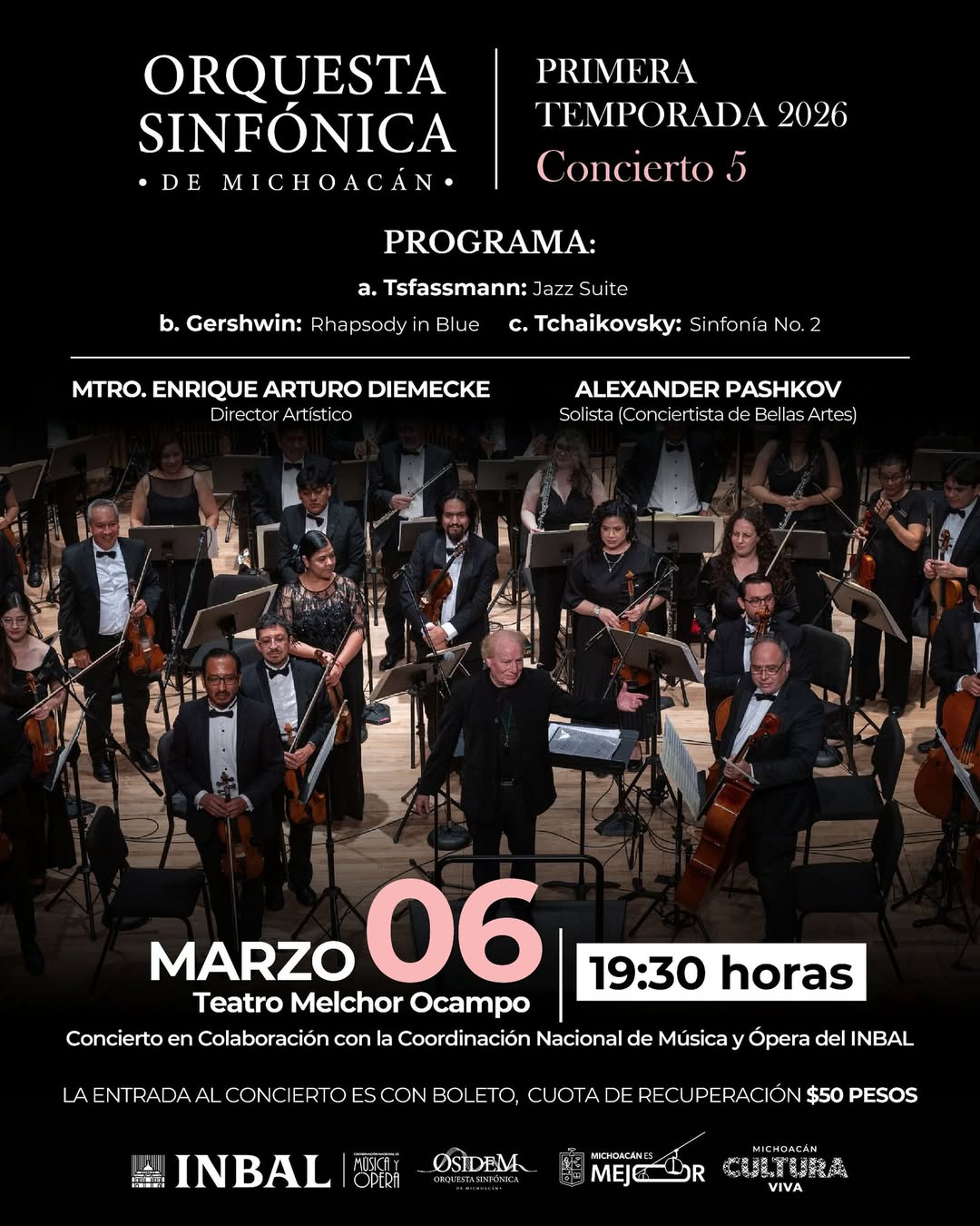Dentro de su Temporada 2026, la Orquesta Sinfónica Michoacán presenta su Concierto 5, en colaboración con la Coordinación Nacional de Música y Ópera del Instituto Nacional de Bellas Artes.